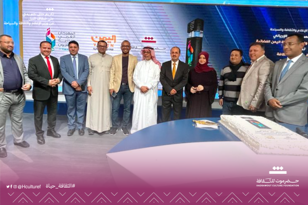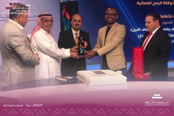 Minister of Media, Culture, and Tourism, Mr. Muammar Al-Eryani, honored Hadhramout Culture Foundation at the Yemen Satellite TV building, represented by Engineer Abdullah Ahmed Baqshan, Chairman of the Board of Founders, and Maestro Mohammed Al-Qahoom, Head of the Music Department. The recognition came on the occasion of the Yemeni Orchestra concert “Yemeni Tunes on the Nile”, which won, jointly with the Kingdom of Morocco, at the 22nd Arab Radio and Television Festival held in Riyadh, Saudi Arabia.
